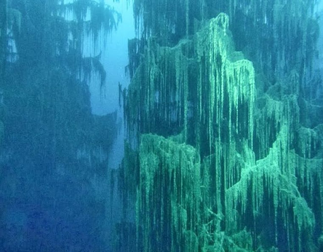 A frieza da água preserva as árvores submersas. Grandes pinheiros permanecem submersos, ficando acima da água os seus enormes troncos.